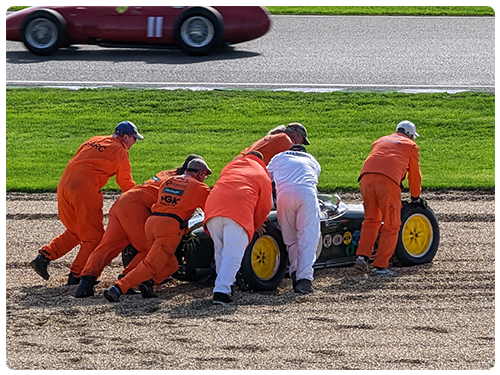 Marshals push a car at Goodwood Revival, 2022